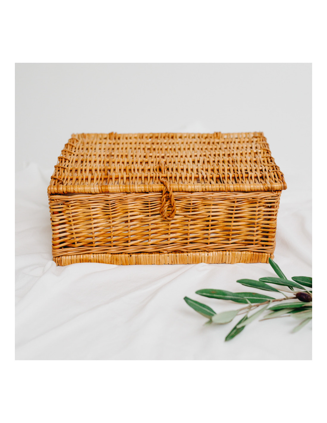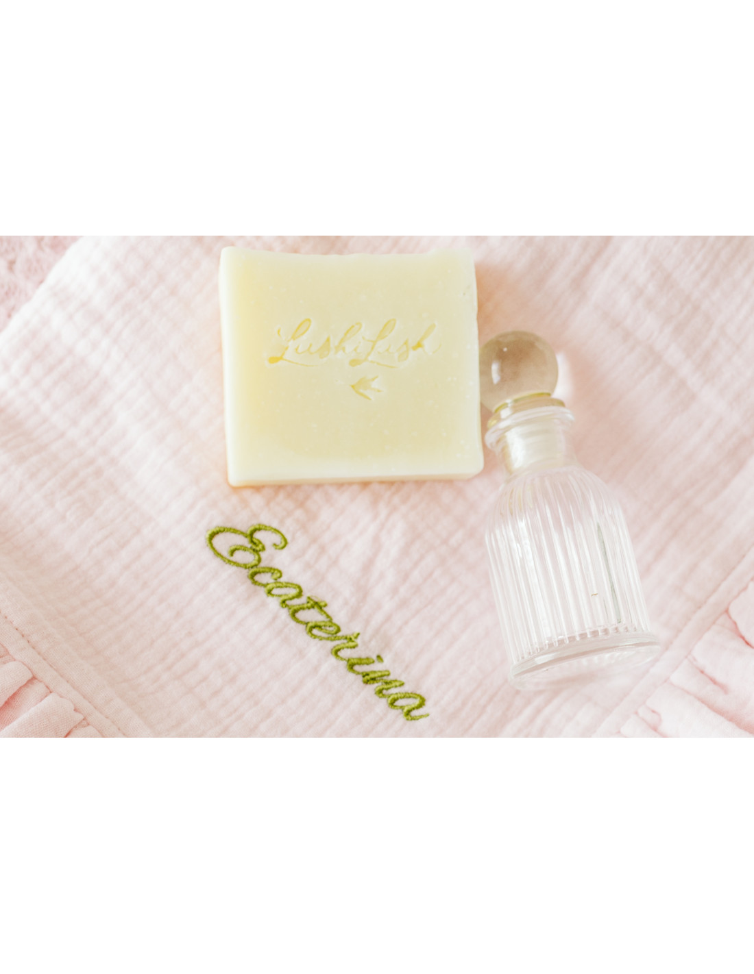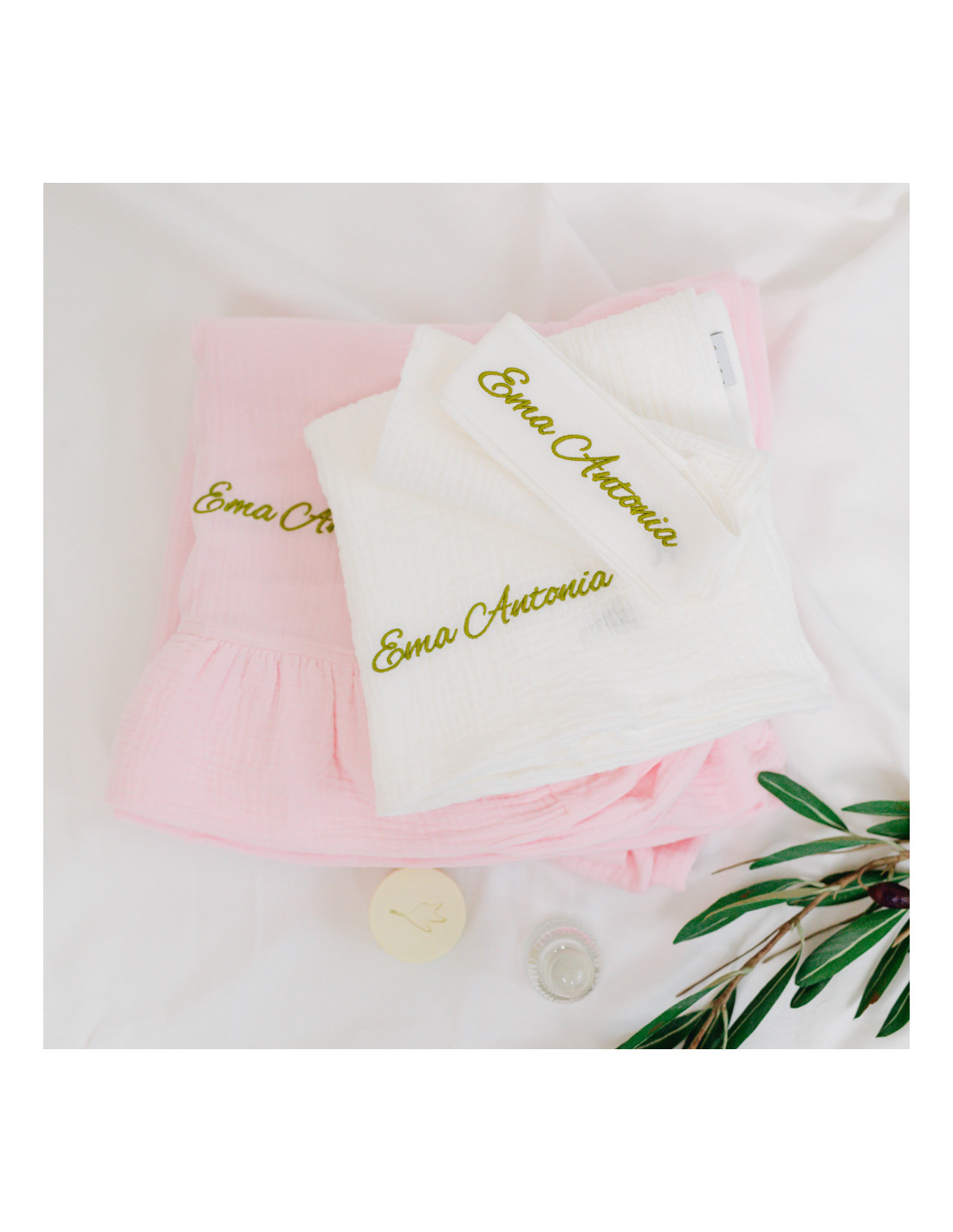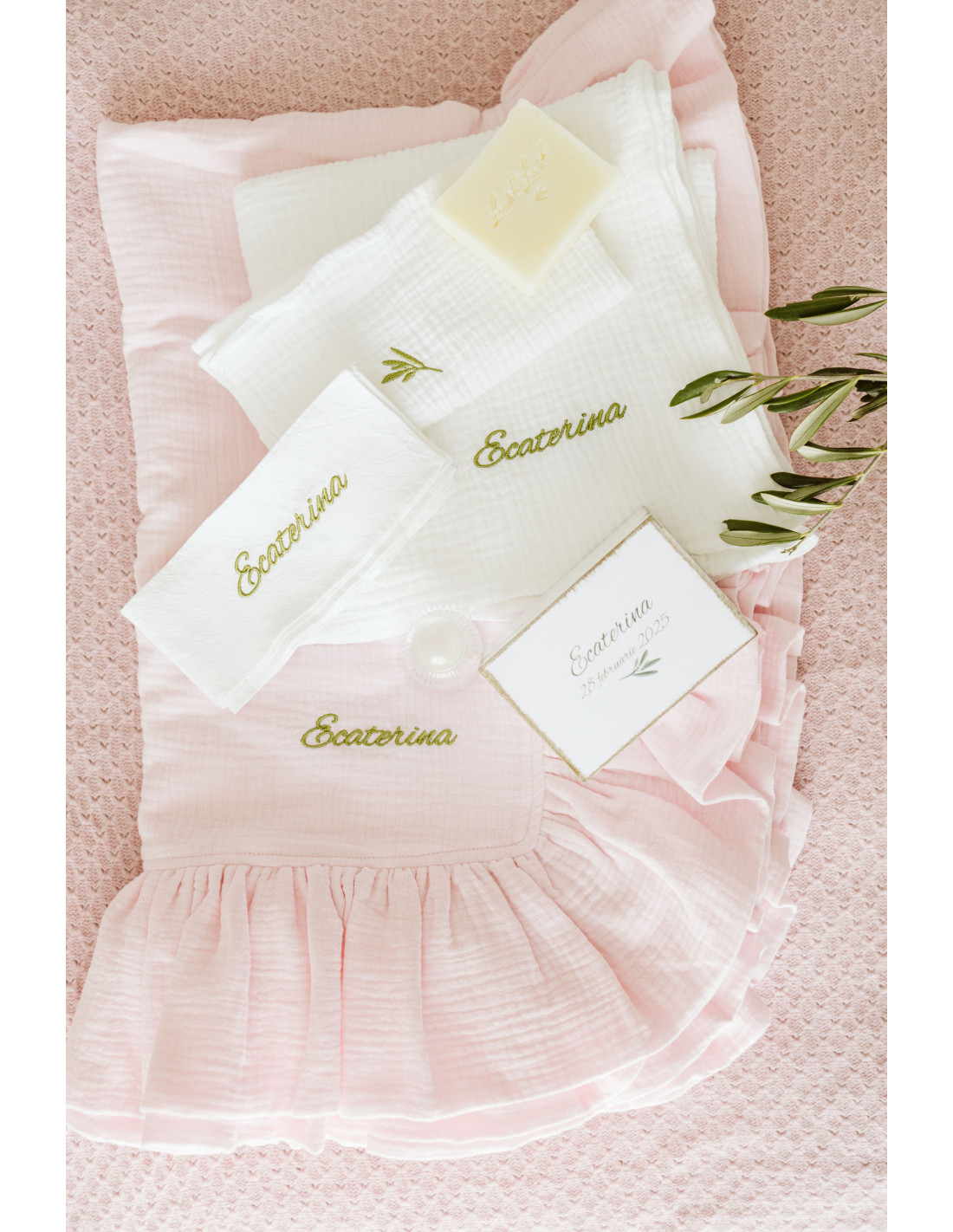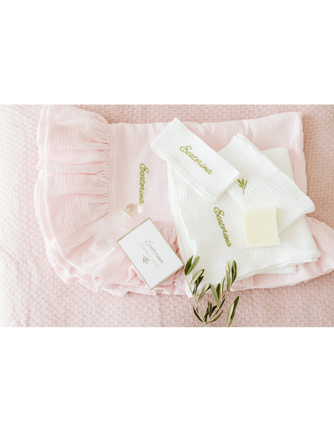 Prosopul-păturică, pânza de mir și fașa sunt brodate cu numele bebelușului și frunza de măslin, parte din logo. Cutiile din lemn sunt, de asemenea, personalizate. Puteți alege fontul broderiei: ”ca de mână” sau de tip ”times new roman”.