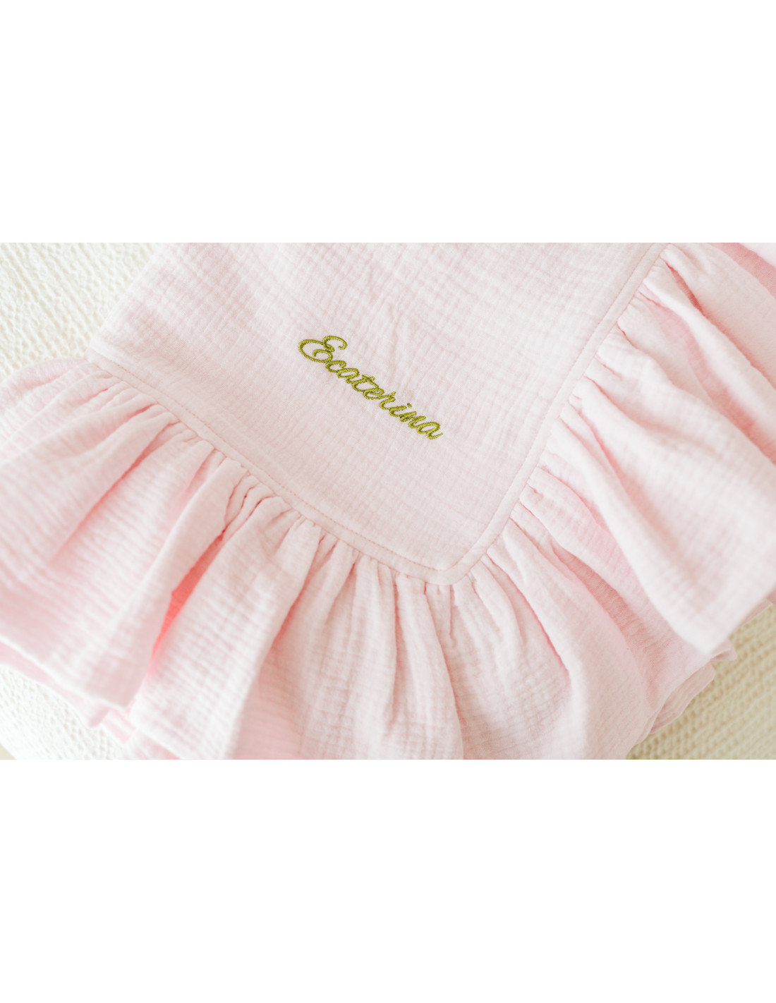 1. Prosop/păturică pentru bebeluș din muselină roz, cu volane.