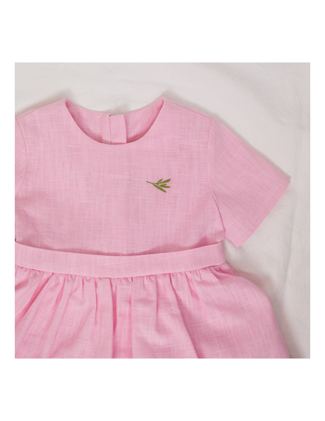 Rochița Miruna, din in roz, are volănașe simpatice și o fundă chic la spate.